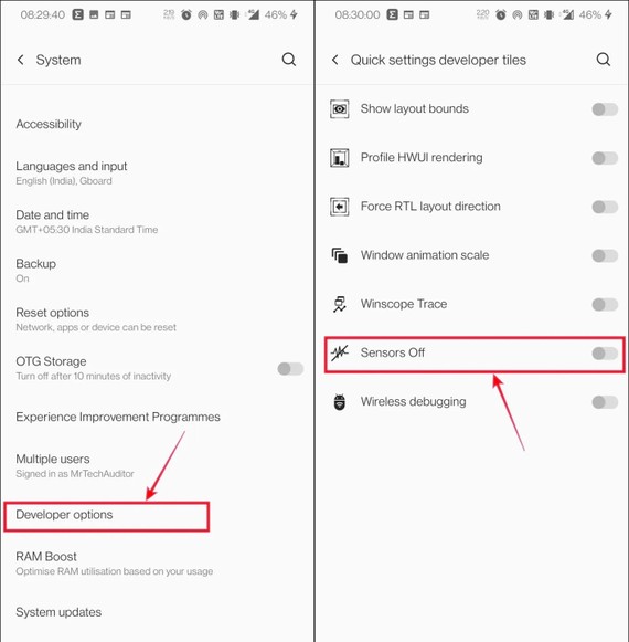 Tiếp theo, người dùng chỉ cần quay ngược lại phần Settings (cài đặt) – System (hệ thống) – Developer options (tùy chọn nhà phát triển) – Quick settings developer tiles – Sensors off (tắt cảm biến).