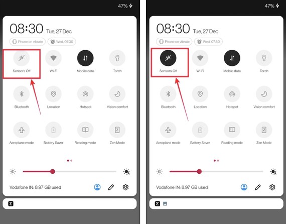 Cuối cùng, bạn hãy vuốt từ cạnh trên màn hình xuống để mở Quick settings (cài đặt nhanh) và tắt tùy chọn Sensors off (tắt cảm biến).